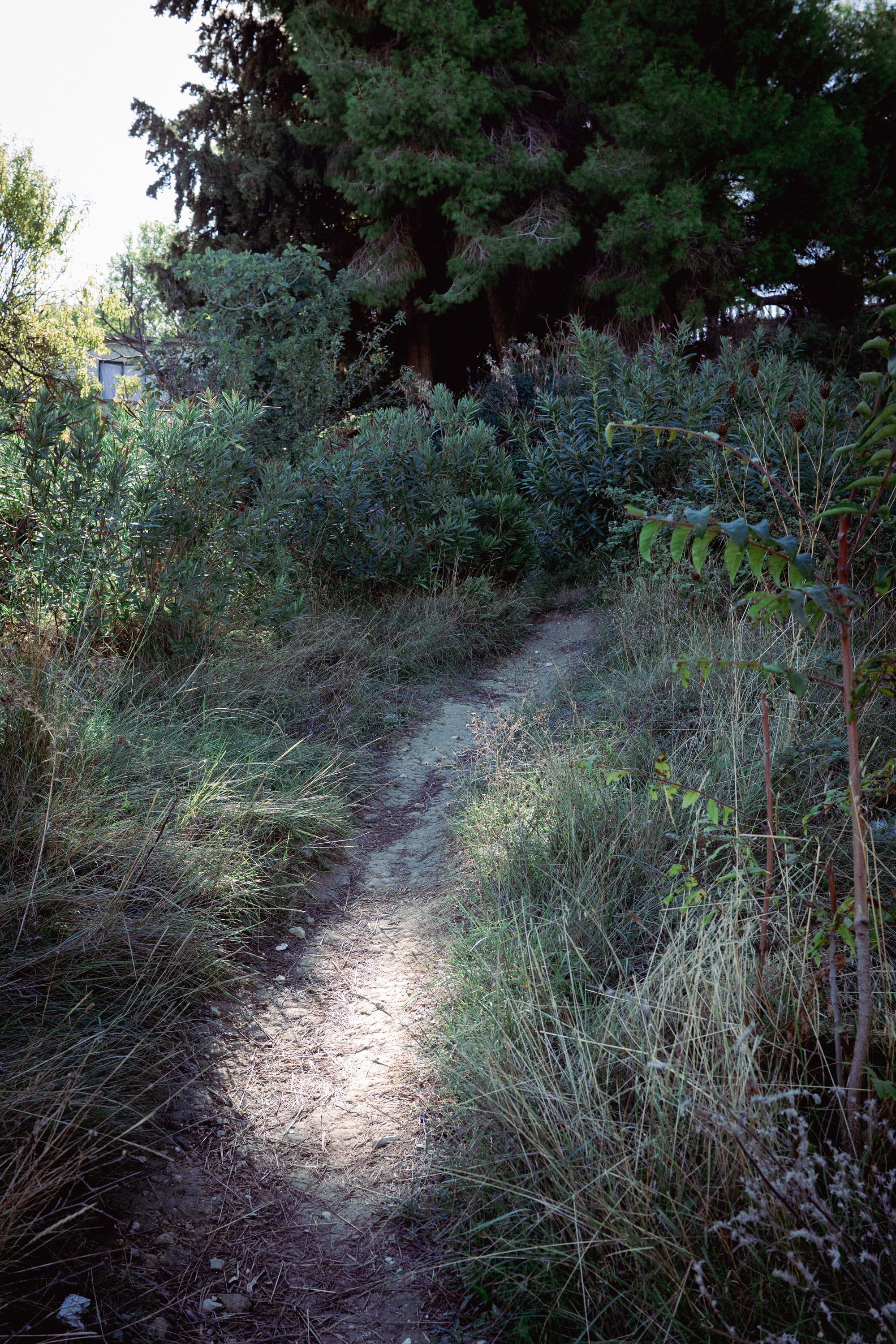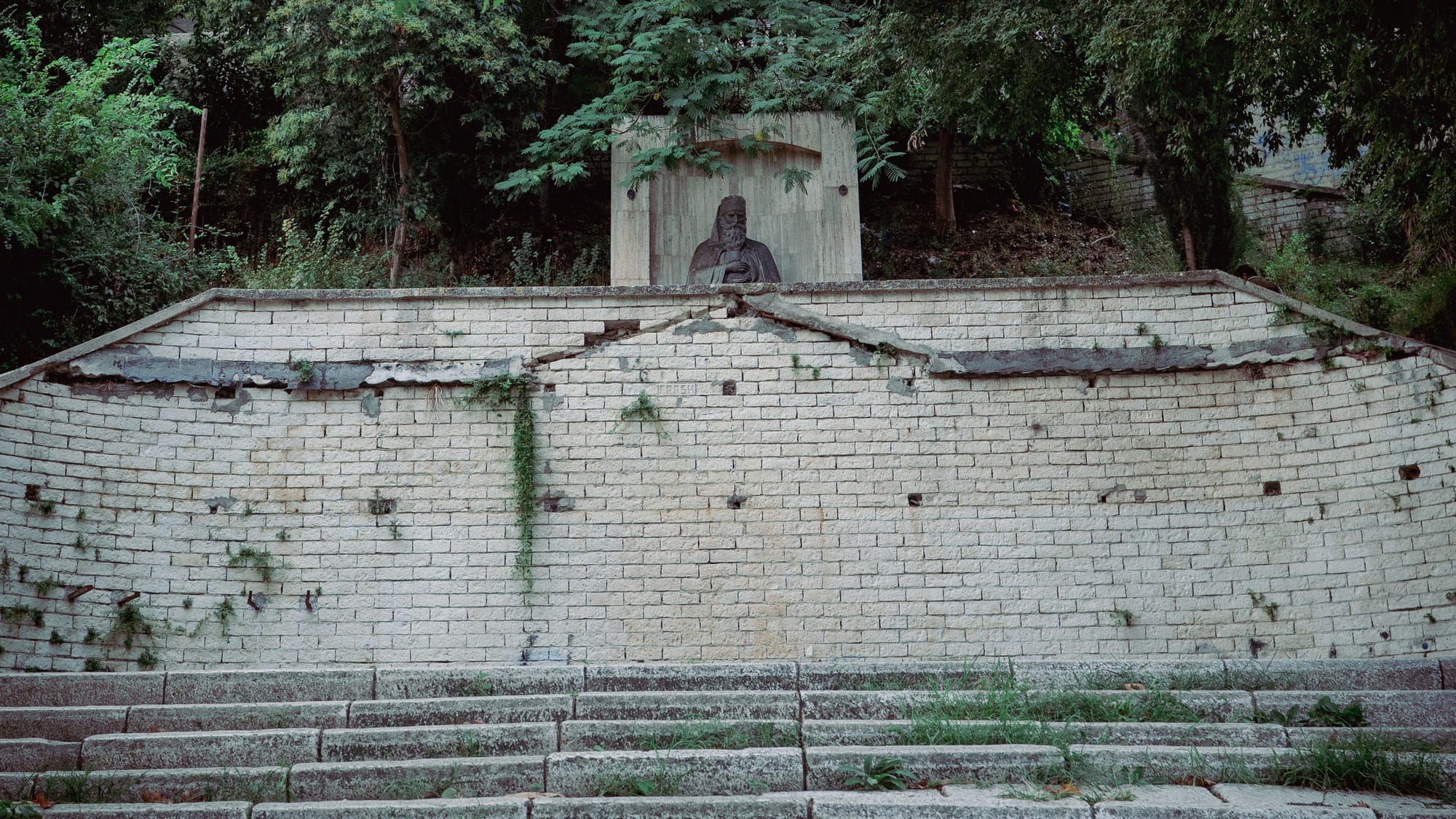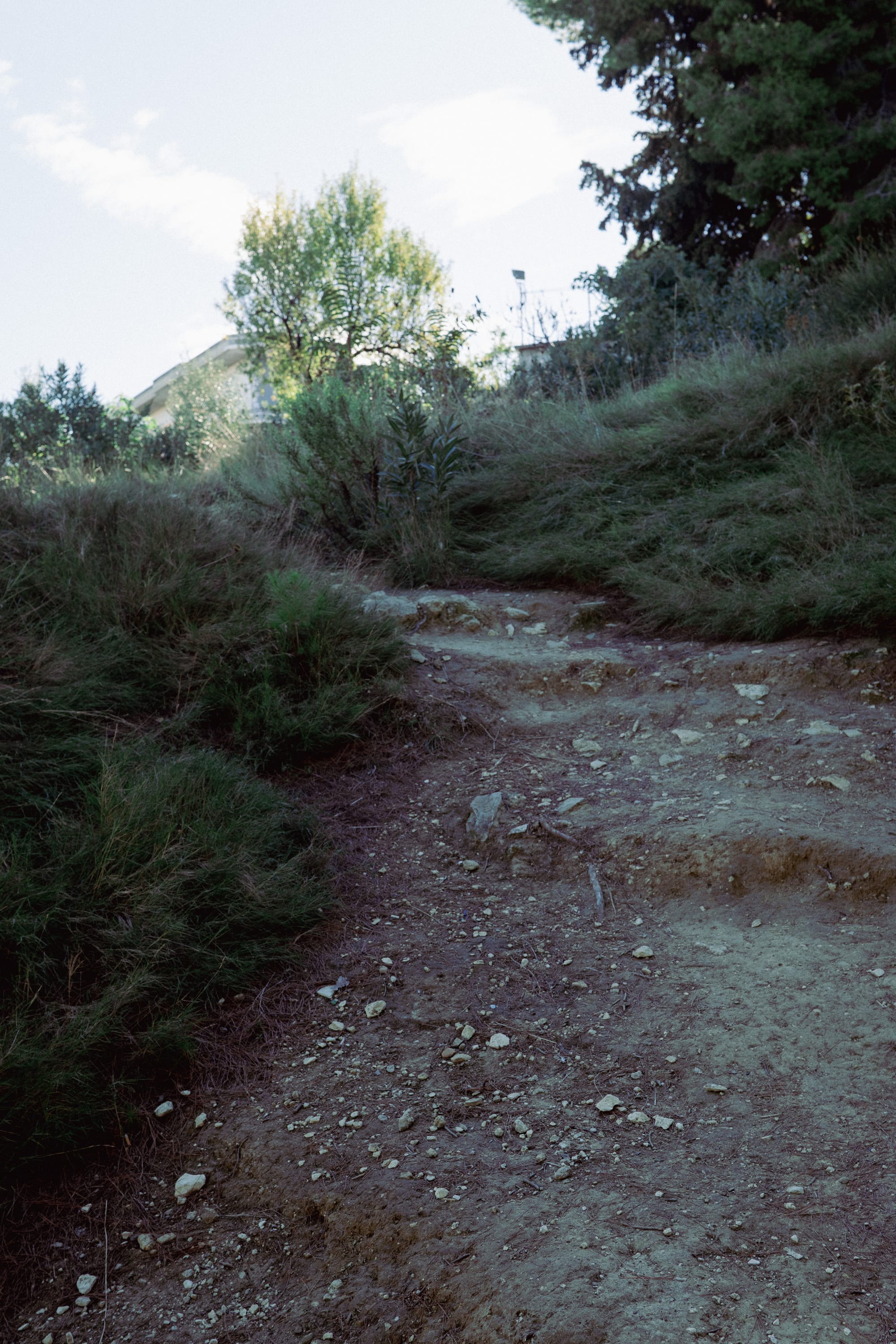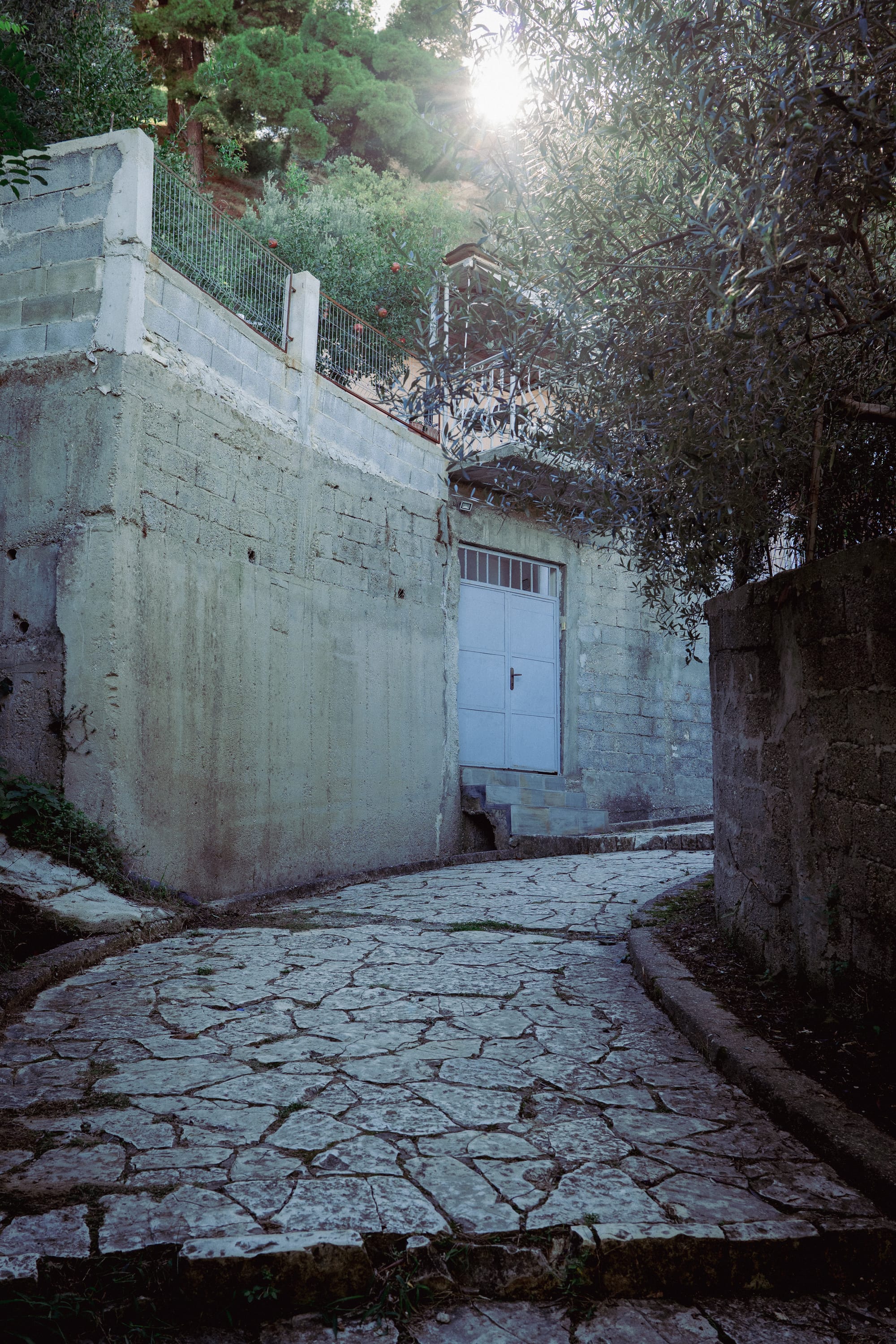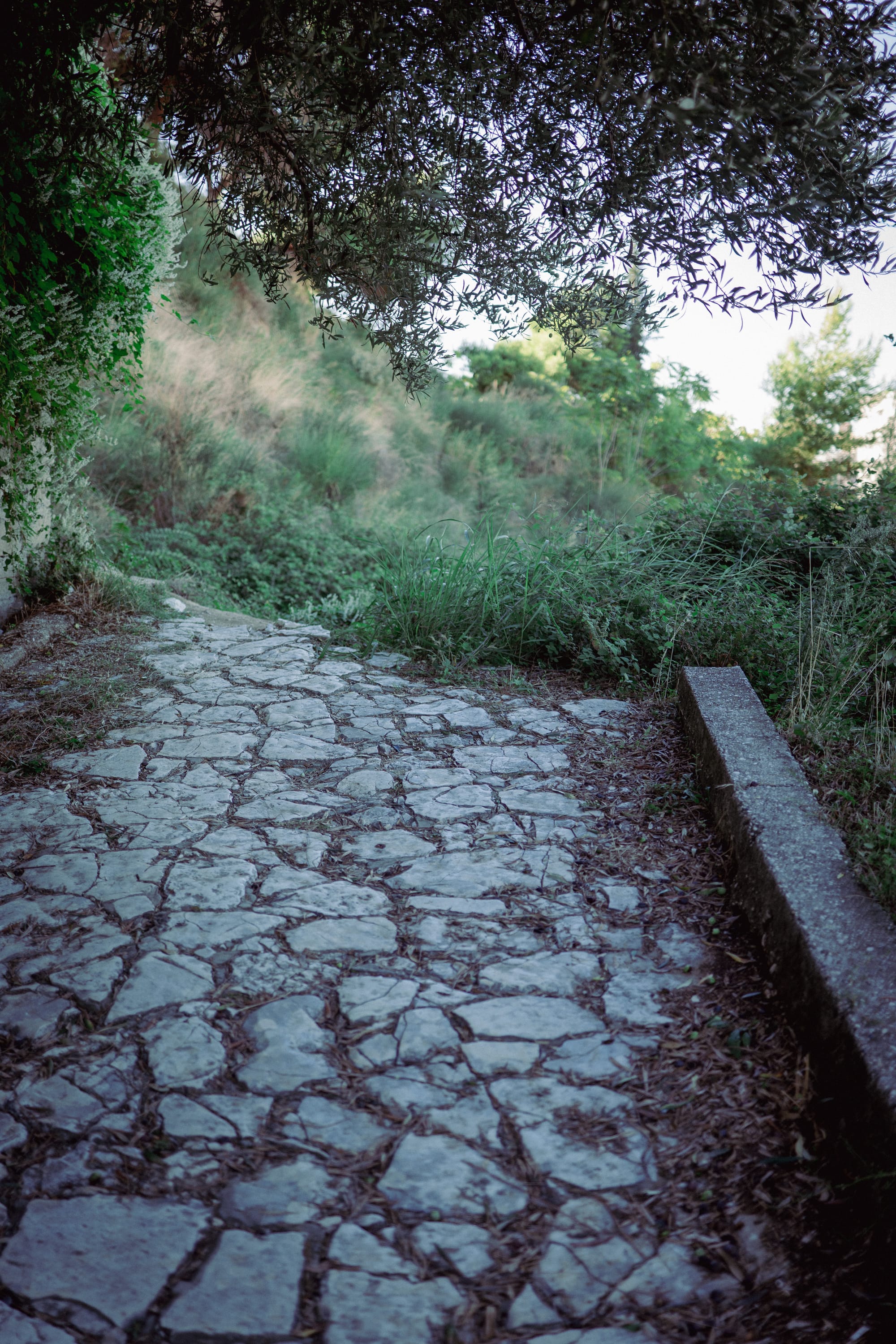 The walkway is completly broken up, veer to the right slighly and make your way up the soil path.