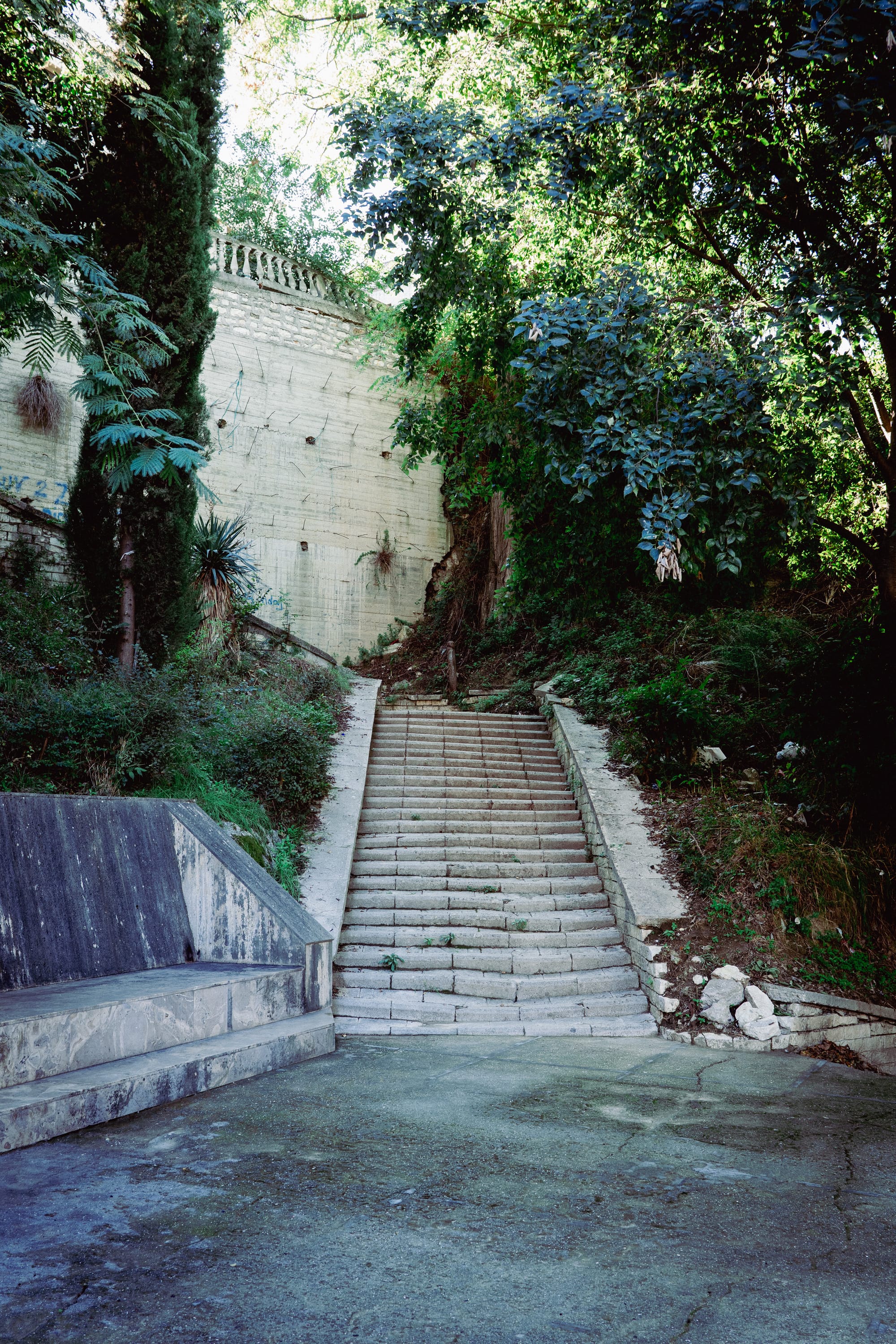 Find the final set of paved steps with a wall on the left.